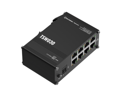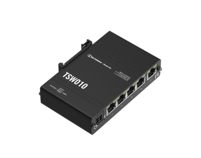 The TSW030 is a cost-efficient unmanaged Ethernet switch, featuring eight 10/100 RJ45 ports and integrated DIN rail mounting. This compact and rugged 8-port switch includes a 2-pin power input and low power consumption of up to 0.5 W when idle and a maximum of up to 1.5 W. These make this plug-and-play switch perfect for industrial applications requiring to connect up to eight devices.